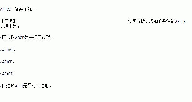 如图,在平行四边形ABCD中,点E、F分别在边BC、AD上,请添加一个条件 ,使四边形AECF是平行四边形(只填一个即可).