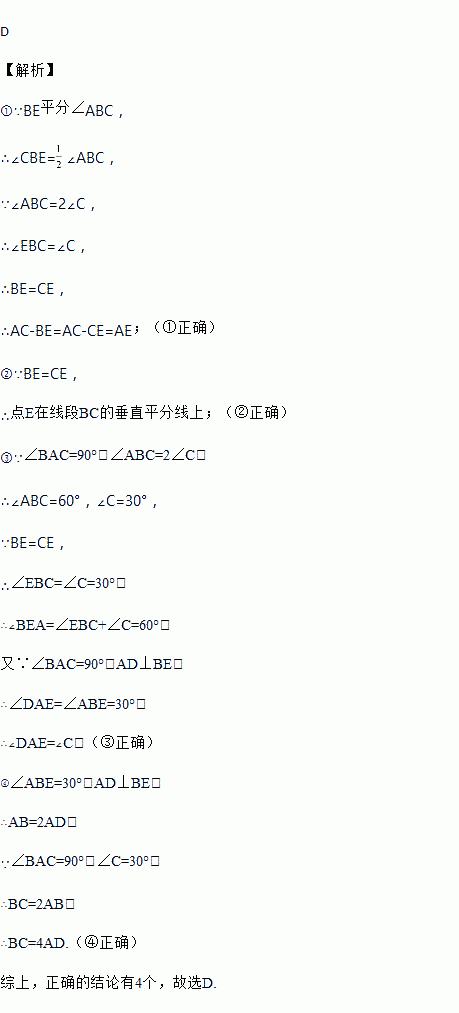 如图,在△ABC 中,∠BAC=90°,∠ABC=2∠C,BE 平分∠ABC 交 AC 于 E,AD⊥BE 于 D,下列结论:①AC﹣BE=AE;②点 E 在线段 BC 的垂直平分线上;③∠DAE=∠C;④BC=4AD,其中正确的个数有( )