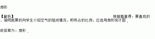 扇形 【解析】根据题意得:要直观的、简明扼要的向学生介绍空气的组成情况,即所占的比例,应选用扇形统计图, 故答案为:扇形.