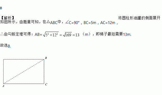 如图,一个圆柱形油罐,油罐的底面周长是12 m,高5 m,要从点A环绕油罐建梯子,正好到达点A的正上方的点B,则梯子最短需要( )
