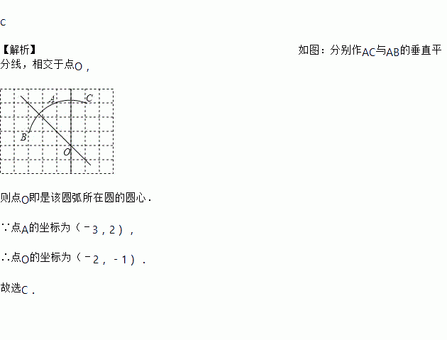 如图,一圆弧过方格的格点A、B、C,在方格中建立平面直角坐标系,使点A的坐标为(﹣3,2),则该圆弧所在圆心坐标是( )