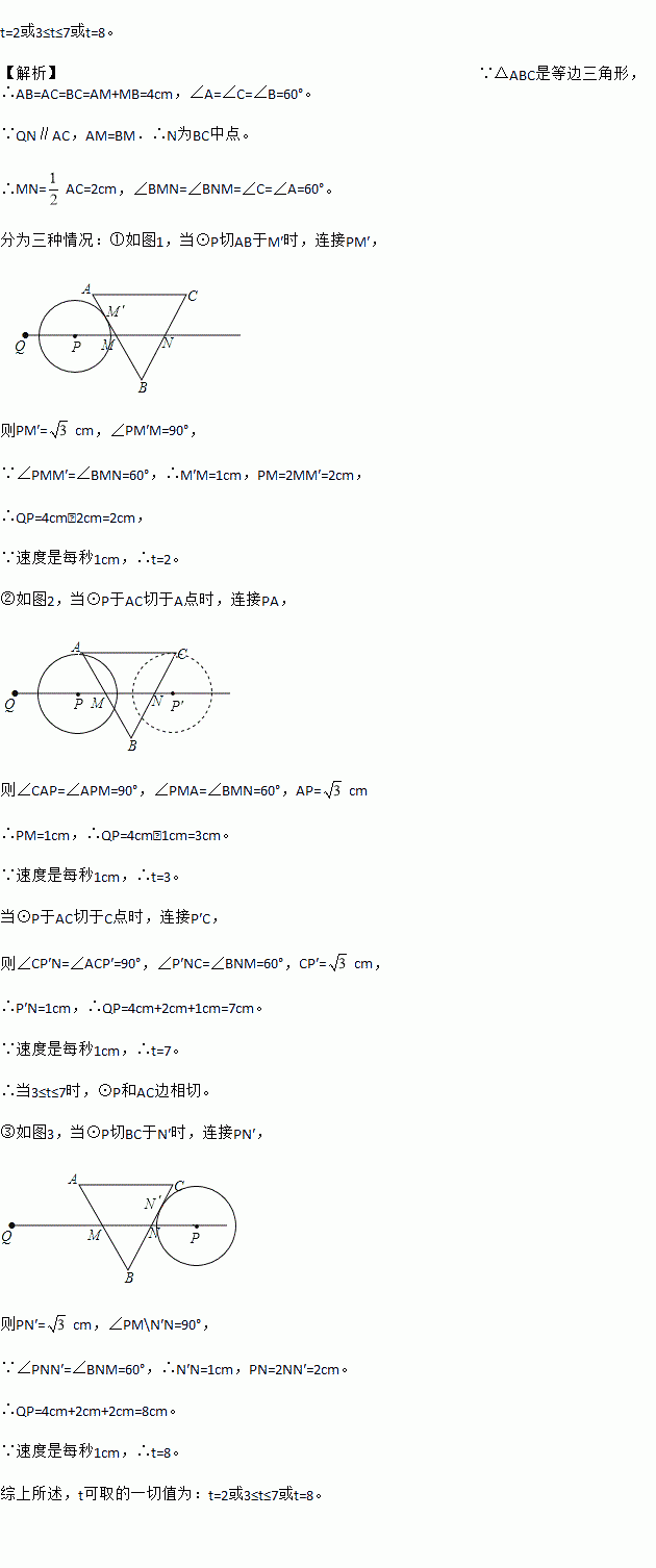 射线QN与等边△ABC的两边AB,BC分别交于点M,N,且AC∥QN,AM=MB=2cm,QM=4cm.动点P从点Q出发,沿射线QN以每秒1cm的速度向右移动,经过t秒,以点P为圆心,