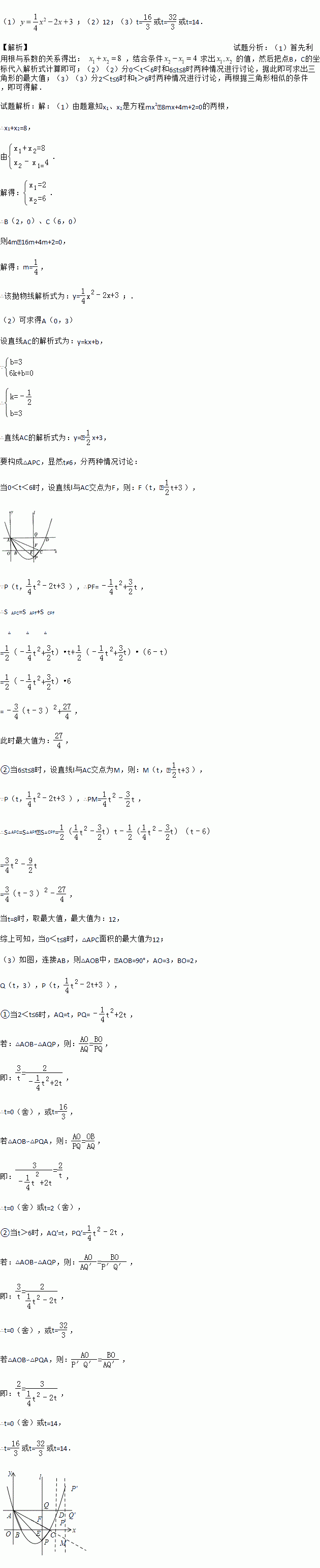 (1);(2)12;(3)t=或t=或t=14. 【解析】试题分析:(1)首先利用根与系数的关系得出: ,结合条件求出的值,然后把点B,C的坐标代入解析式计算即可;(2)(2)分0<t<6时和6≤t≤8时两种情况进行讨论,据此即可求出三角形的最大值;(3)(3)分2<t≤6时和t>6时两种情况进行讨论,再根据三角形相似的条件,即可得解. 试题解析:【解析】 (1)由题意知x1、x2是...
