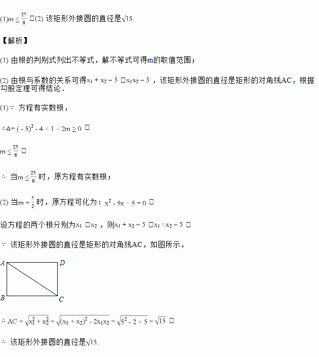 当时,方程的两根分别是矩形的长和宽,求该矩形外接圆的直径.