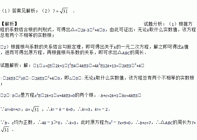 ,且两条直角边的长b和c恰好是这个方程的两个根时,求△ABC的周长.