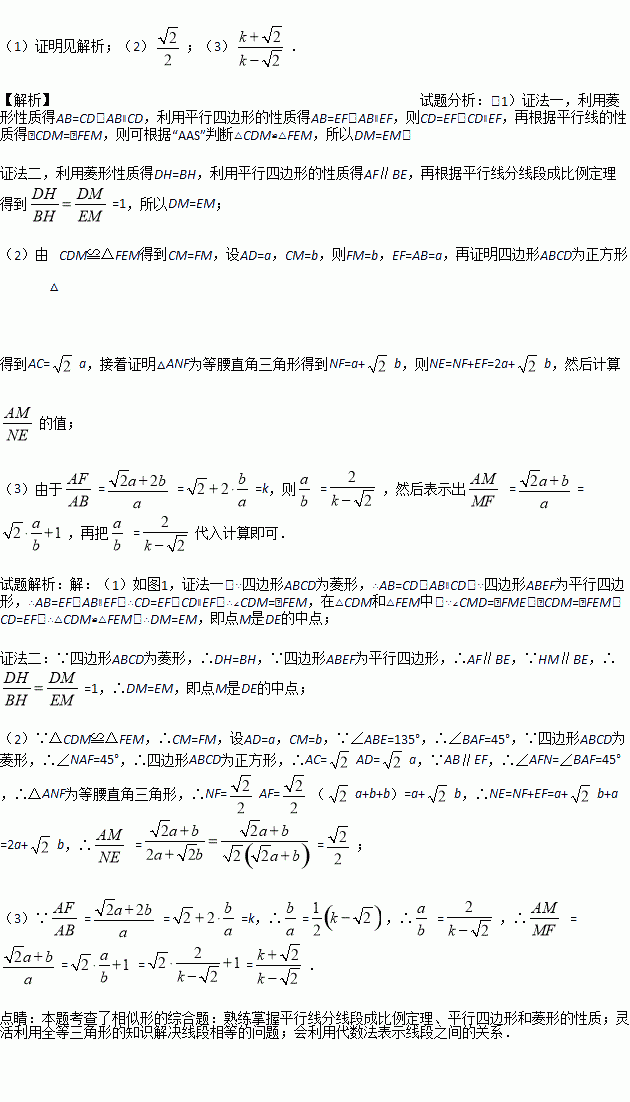 (1)在一次数学活动中,某小组学生将菱形的一边与平行四边形较短边重合,摆拼成如图1所示的图形,AF经过点C,连接DE交AF于点M,观察发现:点M是DE的中点.