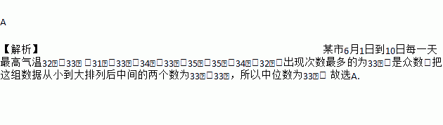 A 【解析】某市6月1日到10日每一天最高气温32℃,33℃ ,31℃,33℃,34℃,33℃,35℃,35℃,34℃,32℃,出现次数最多的为33℃,是众数;把这组数据从小到大排列后中间的两个数为33℃,33℃,所以中位数为33℃, 故选A.