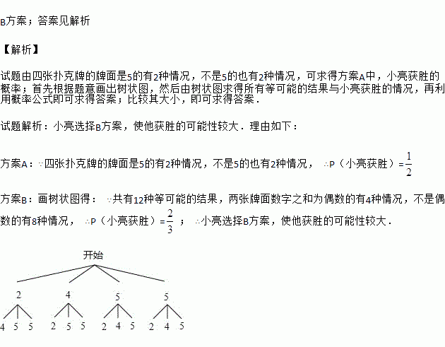 方案B:随机同时抽取两张扑克牌,两张牌面数字之和为偶数时,小明获胜;否则小亮获胜.
