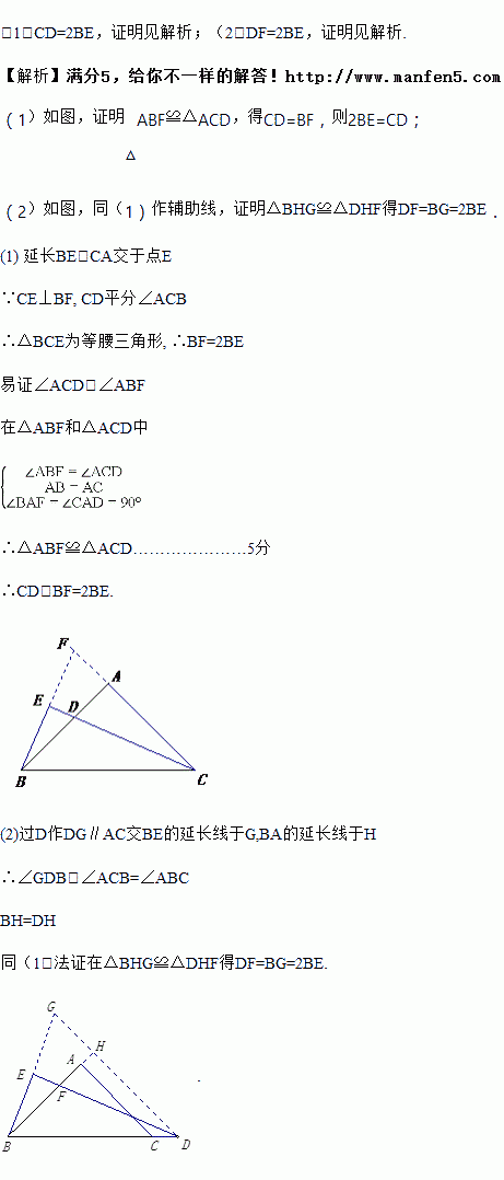 (1)如图,若CD平分∠ACB,BE⊥CD,垂足E在CD的延长线上,试探究线段BE和CD的数量关系,并证明你的结论