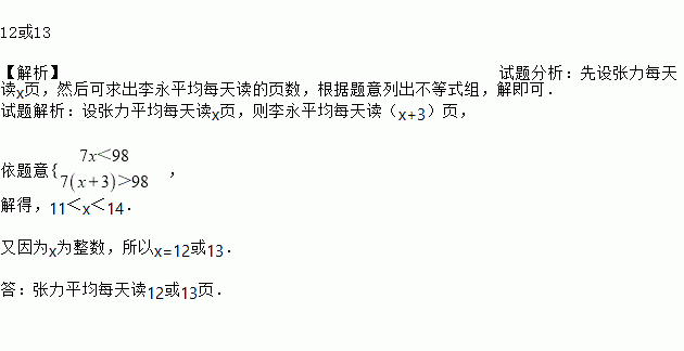 一本英语书共98页,张力读了一周(7天)还没读完,而李永不到一周就已读完,李永平均每天比张力多读3页,张力平均每天读多少页?(答案取整数)