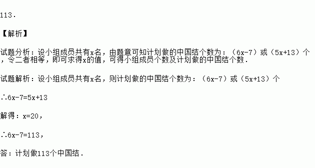 113. 【解析】 试题分析:设小组成员共有x名,由题意可知计划做的中国结个数为:(6x-7)或(5x+13)个,令二者相等,即可求得x的值,可得小组成员个数及计划做的中国结个数. 试题解析:设小组成员共有x名,则计划做的中国结个数为:(6x-7)或(5x+13)个 ∴6x-7=5x+13 解得:x=20, ∴6x-7=113, 答:计划做113个中国结....