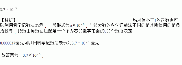一粒某种植物花粉的质量约为0.000 037毫克,0.000 037用科学记数法表示为_______.
