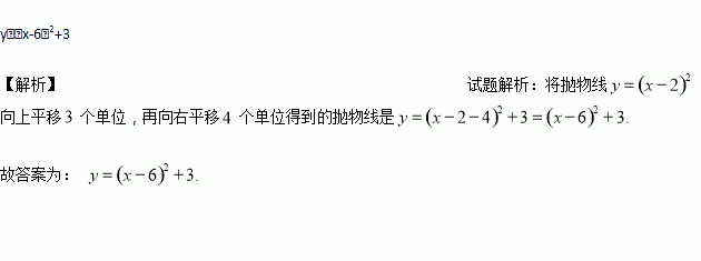 将抛物线y=(x-2)2向上平移3个单位,再向右平移4个单位得到的抛物线是____________.