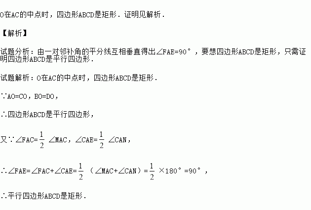 如图,直线MN经过线段AC的端点A,点B、D分别在和的角平分线AE、AF上,BD交AC于点O,如果O是BD的中点,试找出当点O在AC的什么位置时,四边形ABCD是矩形,并说明理由.