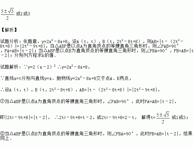 如图,P是抛物线y=2(x﹣2)2对称轴上的一个动点,直线x=t平行y轴,分别与y=x、抛物线交于点A、B.若△ABP是以点A或点B为直角顶点的等腰直角三角形,求满足条件的t的值,则t= .