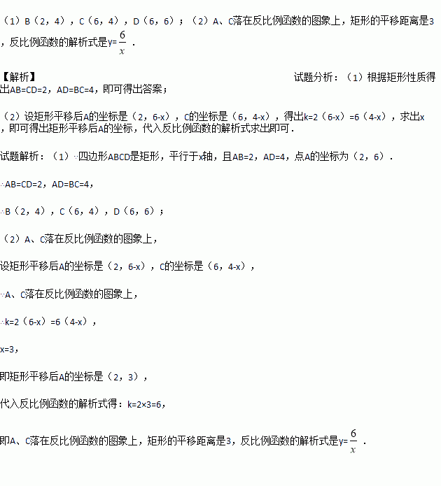 (2)若将矩形向下平移,矩形的两个顶点恰好同时落在反比例函数的图象上,猜想这是哪两个点,并求矩形的平移距离和反比例函数的解析式.