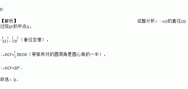 如图,⊙O的直径CD过弦EF的中点G,∠EOD=40°,则∠DCF等于( )