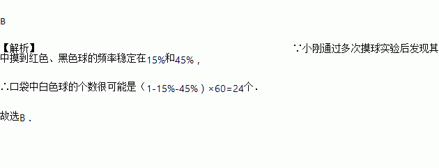 在一个不透明的布袋中,红色、黑色、白色的玻璃球共有60个,除颜色外,形状、大小、质地等完全相同。小刚通过多次摸球实验后发现其中摸到红色、黑色球的频率稳定在15%和45%,则口袋中白色球的个数很可能是( )