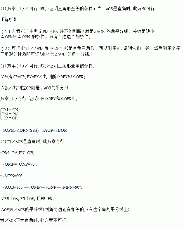 (2)在方案(Ⅰ)PM=PN的情况下,继续移动角尺,同时使PM⊥OA,PN⊥OB.此方案是否可行?请说明理由.