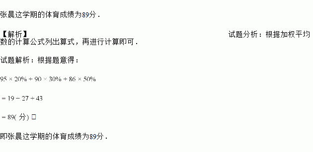 某市规定学生的学期体育成绩满分是100分,其中大课间活动和下午体段占,期中考试占,期末考试占,张晨的三项成绩百分制分别是95分、90分、86分,求张晨这学期的体育成绩.