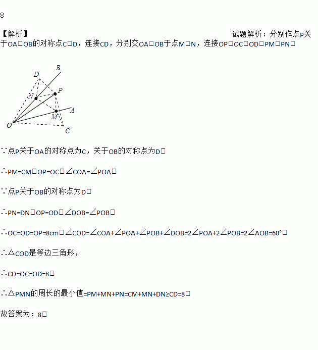 如图,∠AOB=30º,点M、N分别是射线OB、OA上的动点,点P为∠AOB内一点,且OP=8,则△PMN的周长的最小值=___________.