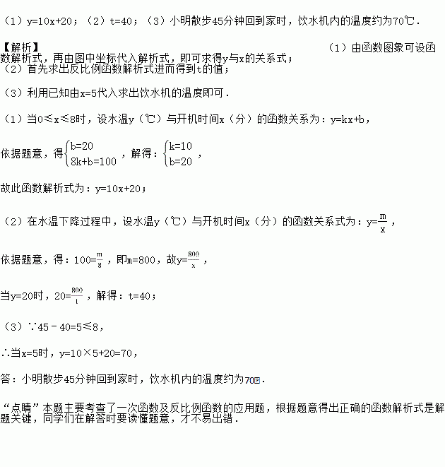(3)若小明在通电开机后即外出散步,请你预测小明散步45分钟回到家时,饮水机内的温度约为多少℃?