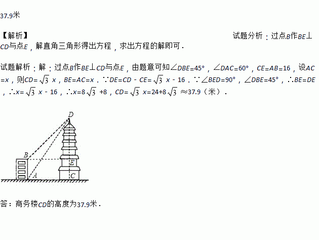 如图,一栋居民楼AB的高为16米,远处有一栋商务楼CD,小明在居民楼的楼底A处测得商务楼顶D处的仰角为60°,又在商务楼的楼顶D处测得居民楼的楼顶B处的俯角为45°.其中A、C两点分别位于B、D两点的正下方,且A、C两点在同一水平线上,求商务楼CD的高度.
