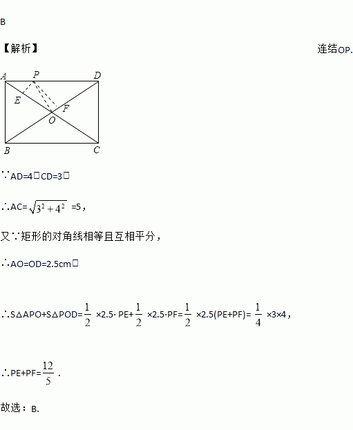 如图,点P是矩形ABCD的边上一动点,矩形两边长AB、BC长分别为3和4,那么P到矩形两条对角线AC和BD的距离之和是( )