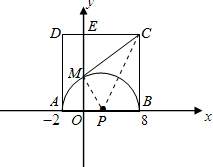 如图,直角坐标系中,A(-2,0),B(8,0),以AB为直径作半⊙P交y轴于M,以AB为一边作正方形ABCD.