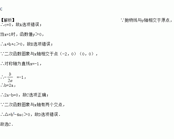 C 【解析】∵抛物线与y轴相交于原点, ∴c=0,故A选项错误; 当x=1时,函数值y>0, ∴a+b+c>0,故B选项错误; ∵二次函数图象与x轴相交于点(-2,0)(0,0), ∴对称轴为直线x=-1, ∴- =-1, ∴b=2a, ∴2a-b=0,故C选项正确; ∵二次函数图象与x轴有两个交点, ∴△=b2-4ac>0,故D选项错误. 故选C.