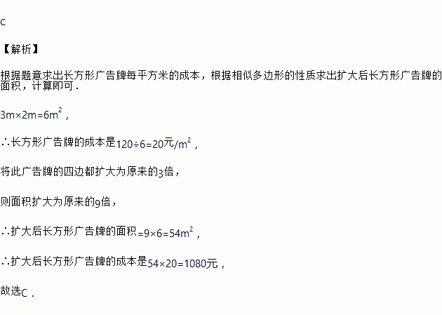 制作一块3m×2m长方形广告牌的成本是120元,在每平方米制作成本相同的情况下,若将此广告牌的四边都扩大为原来的3倍,那么扩大后长方形广告牌的成本是( )