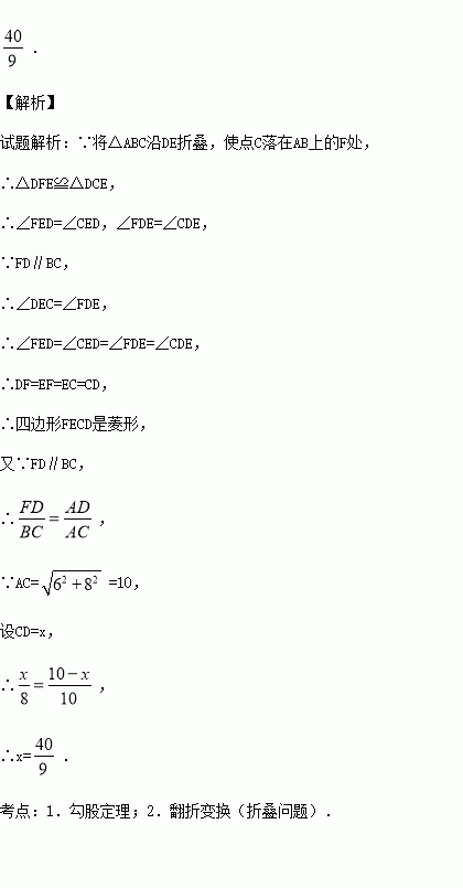 如图,△ABC中,∠B=90°,AB=6,BC=8,将△ABC沿DE折叠,使点C落在AB上的F处,并且FD∥BC,则CD长为 _ _ ___.