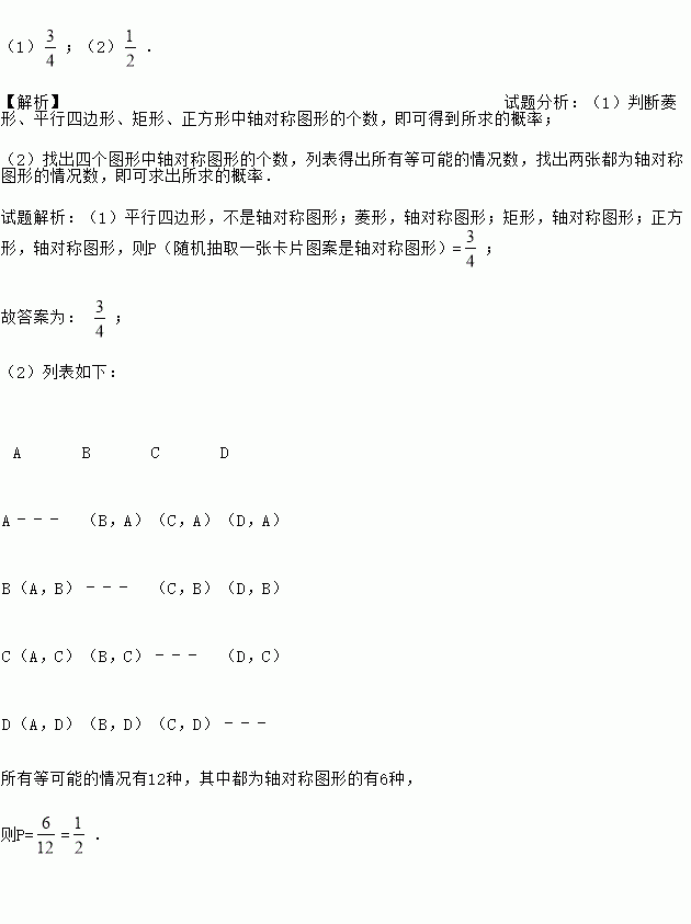 (1)随机抽取一张卡片图案是轴对称图形的概率是 ;