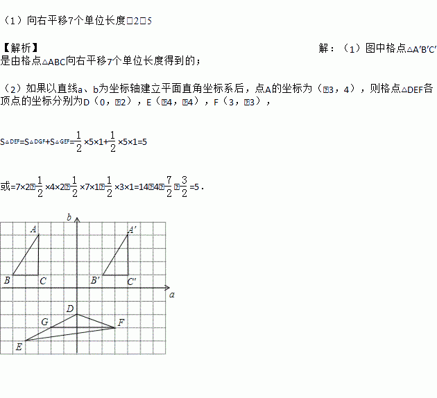 (2)如果以直线a,b为坐标轴建立平面直角坐标系后,点A的坐标为(-3,4),请写出格点三角形DEF各顶点的坐标,并求出三角形DEF的面积.