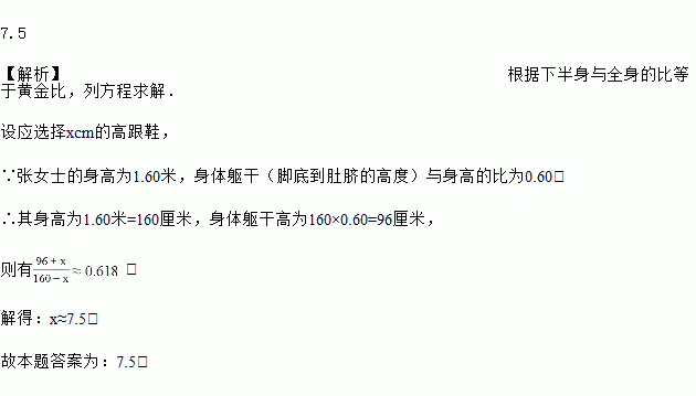 在人体躯干和身高的比例上,肚脐是理想的黄金分割点,即比例越接近0.618越给人以美感.张女士的身高为1.60米,身体躯干(脚底到肚脐的高度)与身高的比值为0.60,那么她穿约________厘米的高跟鞋看起来会更美.(精确到十分位)