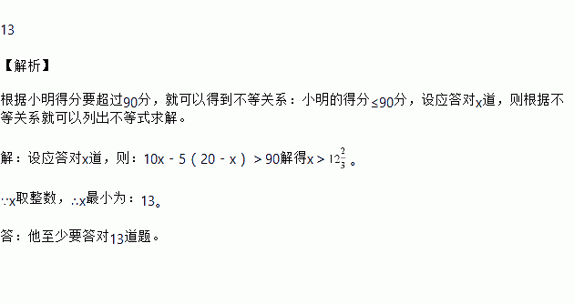 某次知识竞赛共有20道题,每一题答对得10分,答错或不答都扣5分,小明得分要超过90分,他至少要答对多少道题?