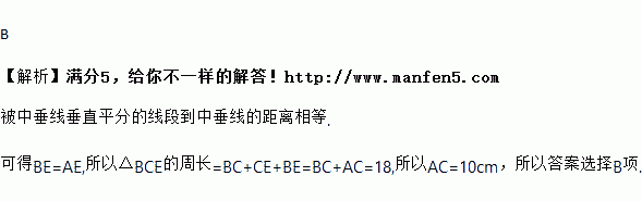 如图,在△ABC中,BC=8cm,AB的垂直平分线交AB于点D,交边AC于点E,△BCE的周长等于18cm,则AC的长等于( )