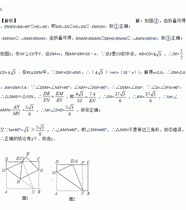 C 【解析】【解析】 如图③,由折叠可得,∠MEN=∠A=90°,HG⊥NE,即ME⊥EN,HG⊥EN,∴EM∥GH,故①正确; ∵EM∥GH,∴∠NME=∠NHG,由折叠可得,∠NME=∠AMN,∠EHG=∠NHG,∴∠AMN=∠EHG,故③正确; 如图2,作NF⊥CD于F.设DM=x,则AM=EM=10﹣x.∵点E是CD的中点,AB=CD=,∴DE=CD=.在Rt△DEM中...