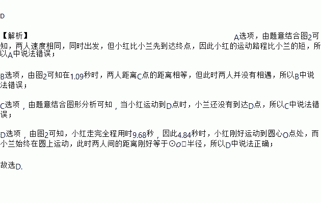 D ¡¾½âÎö¡¿AÑ¡ÏÓÉÌâÒâ½áºÏͼ2¿ÉÖª£¬Á½ÈËËÙ¶ÈÏàͬ£¬Í¬Ê±³ö·¢£¬µ«Ð¡ºì±ÈСÀ¼Ïȵ½´ïÖյ㣬Òò´ËСºìµÄÔ˶¯Â·³Ì±ÈСÀ¼µÄ¶Ì£¬ËùÒÔAÖÐ˵·¨´íÎó£» BÑ¡ÏÓÉͼ2¿ÉÖªÔÚ1.09Ãëʱ£¬Á½È˾àÀëCµãµÄ¾àÀëÏàµÈ£¬µ«´ËʱÁ½È˲¢Ã»ÓÐÏàÓö£¬ËùÒÔBÖÐ˵·¨´íÎó£» CÑ¡ÏÓÉÌâÒâ½áºÏͼÐηÖÎö¿ÉÖª£¬µ±Ð¡ºìÔ˶¯µ½Dµãʱ£¬Ð¡À¼»¹Ã»Óе½´ïDµã£¬ËùÒÔCÖÐ˵·¨´íÎó£» DÑ¡ÏÓÉͼ2¿ÉÖª£¬Ð¡ºì×ßÍêÈ«³ÌÓÃʱ9.68Ãë...