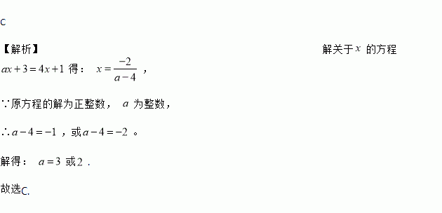 关于x的方程ax+3=4x+1 的解为正整数,则整数a的值为( )