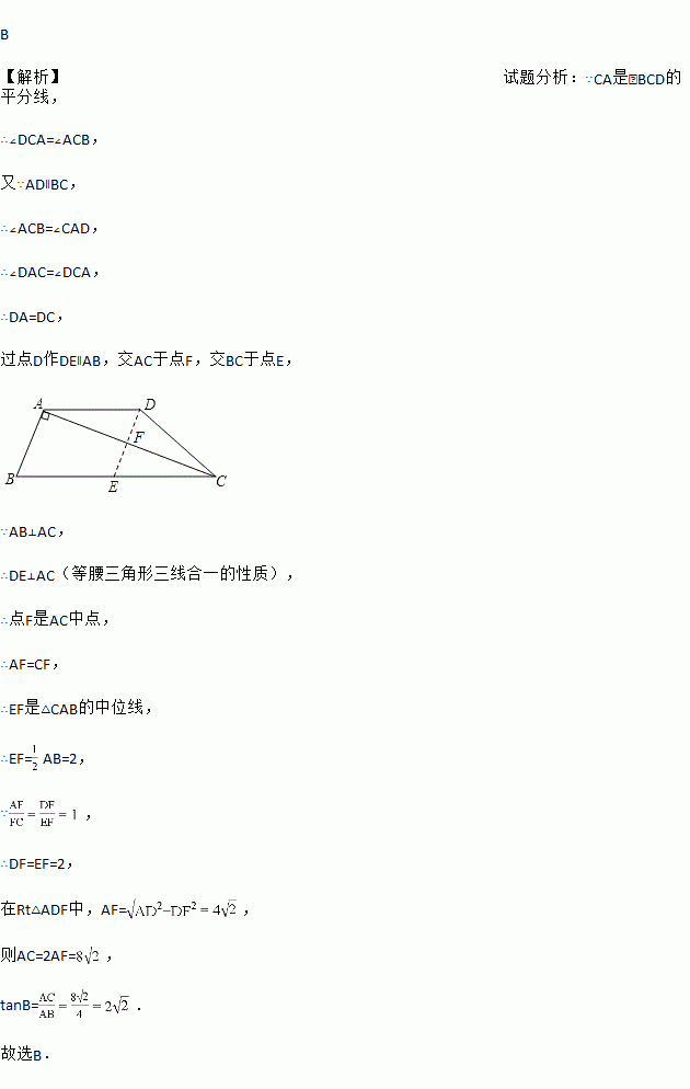 如图所示,四边形ABCD是梯形,AD∥BC,CA是∠BCD的平分线,且AB⊥AC,AB=4,AD=6,则tanB=( )