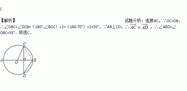 如图,AB是⊙O的直径,AB垂直于弦CD,∠BOC=70°,则∠ABD=( )