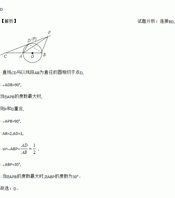 D 【解析】试题分析:连接BD, ∵直线CD与以线段AB为直径的圆相切于点D, ∴∠ADB=90°, 当∠APB的度数最大时, 则P和D重合, ∴∠APB=90°, ∵AB=2,AD=1, ∴sin∠ABP=, ∴∠ABP=30°, ∴当∠APB的度数最大时,∠ABP的度数为30°. 故选:D.