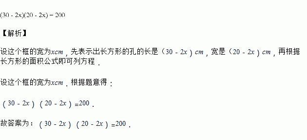 有一块长,宽的纸板,要挖出一个面积为的长方形的孔,并且四周宽度相等,若设这个框的宽为,则可得方程为________.