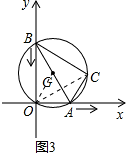 图1是用钢丝制作的一个几何探究工具,其中△ABC内接于⊙G,AB是⊙G的直径,AB=6,AC=2.现将制作的几何探究工具放在平面直角坐标系中(如图2),然后点A在射线OX上由点O开始向右滑动,点B在射线OY上也随之向点O滑动(如图3),当点B滑动至与点O重合时运动结束. 在整个运动过程中,点C运动的