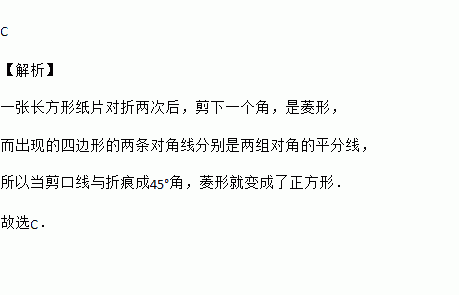 、如图,把一个长方形纸片对折两次,然后剪下一个角,为了得到一个正方形,剪刀与折痕所成的角的度数应为……( )