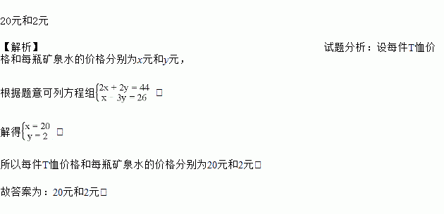 根据下图给出的信息,则每件T恤价格和每瓶矿泉水的价格分别为_________.