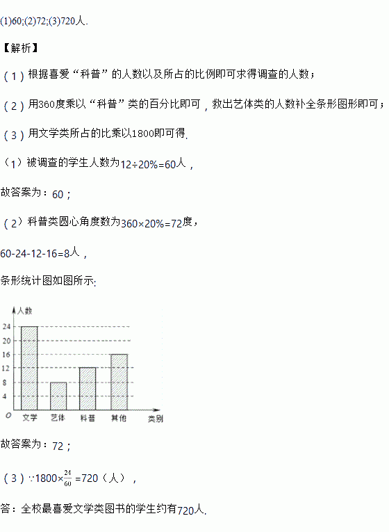 (3)已知该校有1800名学生,估计全校最喜爱文学类图书的学生有多少人?