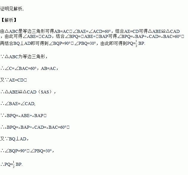 已知,如图,△ABC为等边三角形,AE=CD,AD、BE相交于点P,BQ⊥AD于Q,求证:PQ=BP.