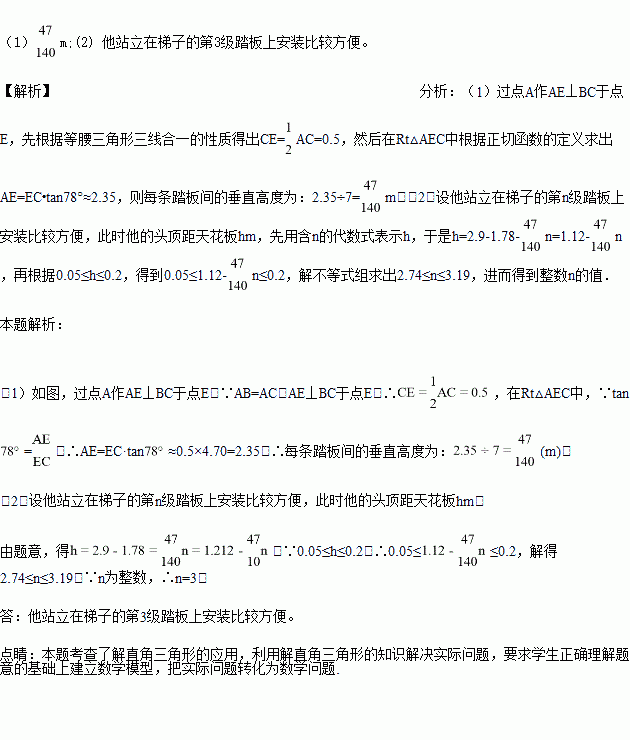 (2)请问他站立在梯子的第几级踏板上安装比较方便?请你通过计算判断说明。(参与数据:sin